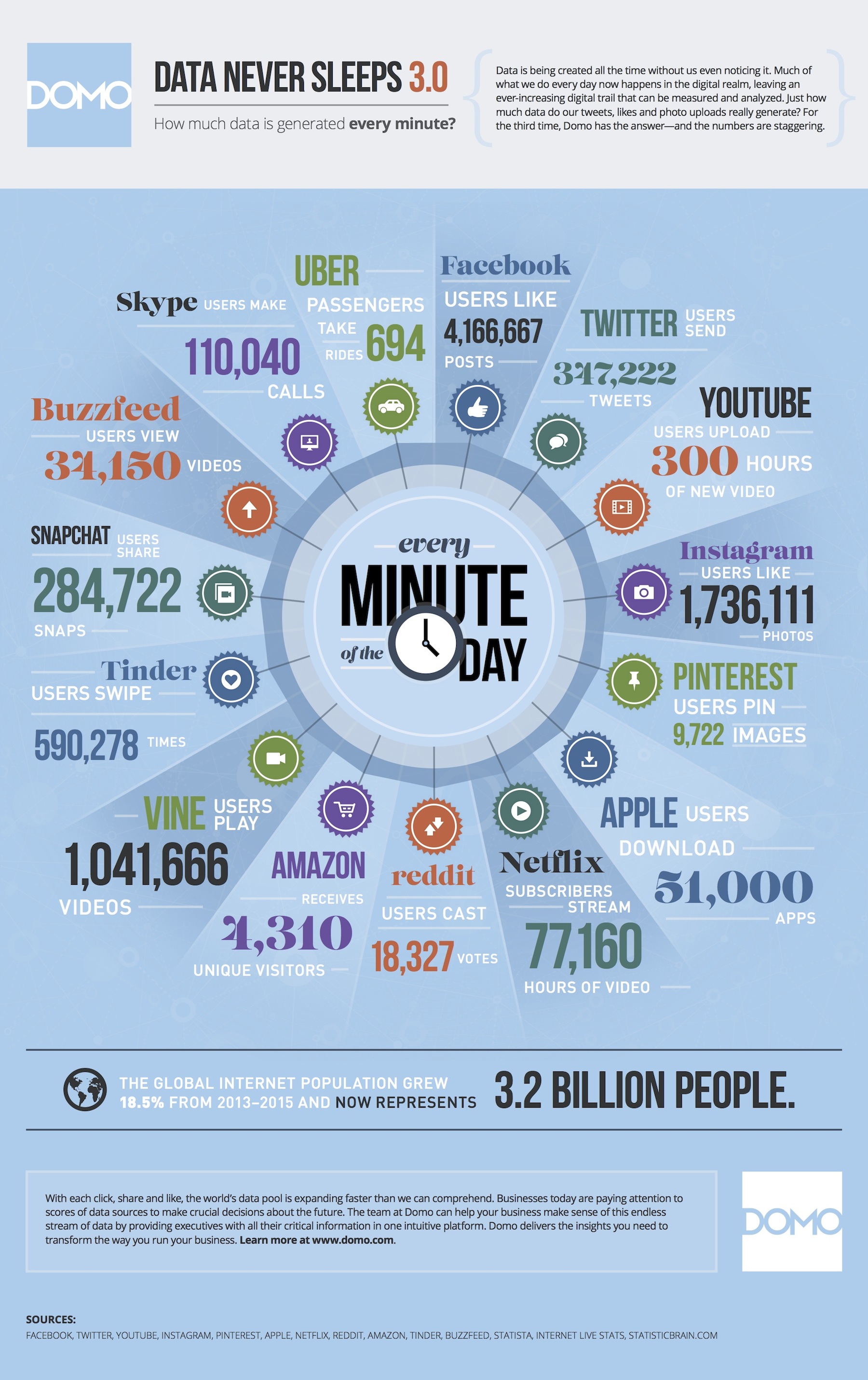 Chaque minute, les membres de Facebook aiment plus de 4 millions de posts, 347 222 tweets sont envoyés, 284 722 snaps sont partagés sur Snapchat, etc. Ces chiffres, toujours impressionnants à lire, sont extraits d’une infographie de DOMO. Laissez-vous surprendre !